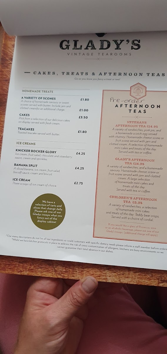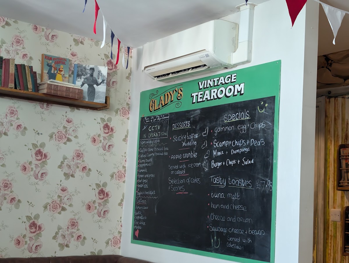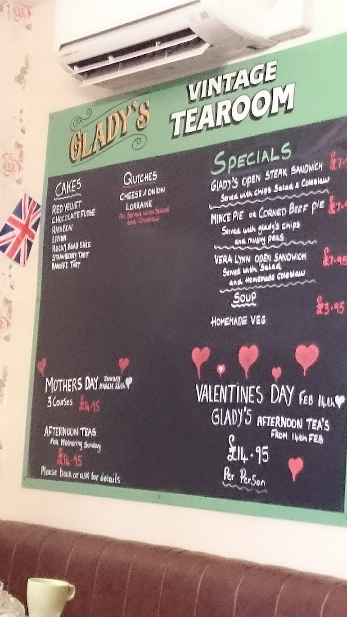 At Glady's Vintage Tea Room, the menu offers a delightful mix of comforting and indulgent treats perfect for any occasion. For those in need of a calming drink, their Green Tea is a perfect choice from the speciality teas selection. If you're after something more substantial, the Burger + Chips + Salad is a filling option from the specials. The homemade treats are a real highlight, featuring a variety of Scones, Cakes, and Teacakes, each made to perfection. For dessert, their Knicker Bocker Glory and Banana Split are perfect ways to satisfy any sweet tooth, while a simple scoop of Ice Cream is always a crowd-pleaser. For those seeking the quintessential afternoon tea experience, Glady's offers pre-order options, including the Veterans Afternoon Tea, Glady's Afternoon Tea, and the Children's Afternoon Tea, ensuring there's something for everyone. Whether you’re looking for a light snack or a full meal, the menu at Glady's Vintage Tea Room promises a cozy and satisfying dining experience.